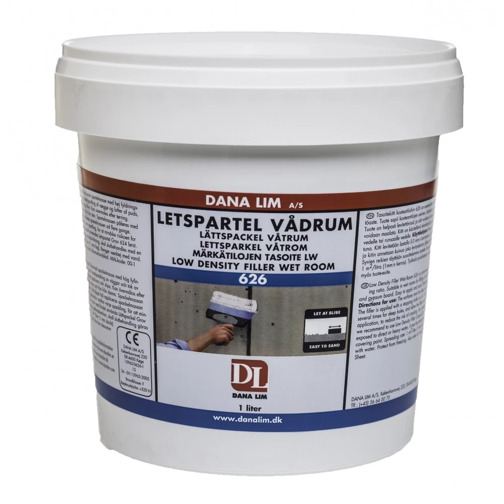 Letspartel Vådrum er 626 har en særlig høj fyldningsgrad og minimalt svind. Den er velegnet til overmaling med dispersions- og alkydmalinger.