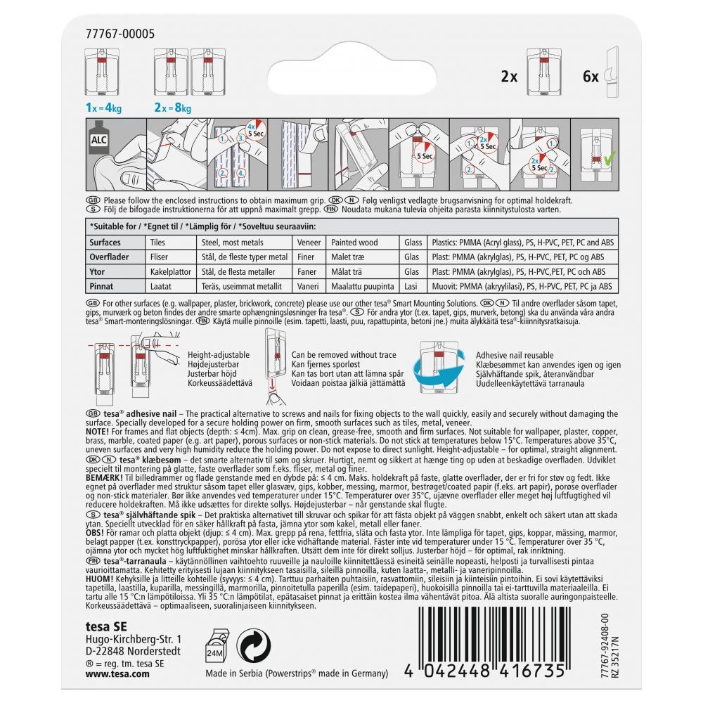 Til indendørs brug på glatte og faste overflader, f.eks. fliser. Kan bære genstande på op til 4 kg pr. søm (8 kg ved brug af 2 søm) Højdejusterbare, så du kan få tingene til at hænge pænt og lige. Kan fjernes uden at efterlade klæberester. Kan genanvendes med en ny strip